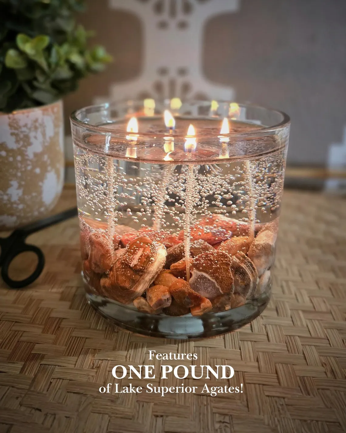 This candle features a whopping ONE POUND of natural Lake Superior Agates inside! These stones are a mix of sizes and characteristics- true to their real nature! Enjoy their glow inside a clear, scented gel candle wax. When the candle is finished, the agates are yours to keep forever!
